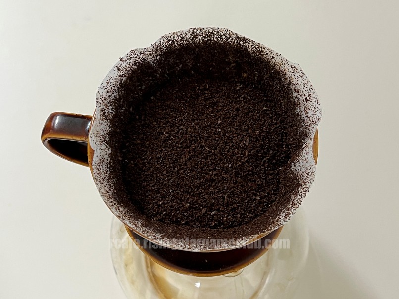 크기 10으로 갈면 사진 속에 보이는 정도 입자 크기입니다. 제가 사무실에서 개인적으로 사용하는 그라인더는 분쇄도가 따로 있는 제품은 아닌데요. 집에서 분쇄한 입자 크기를 보고 가늠해서 분쇄도를 맞추고 있어요.