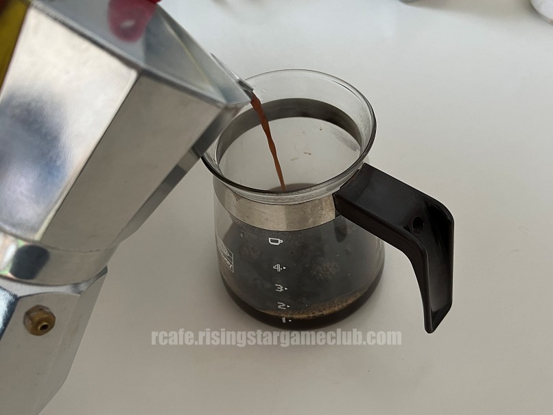 잘 추출된 커피를 따라서 드시면 되는데요. 너무 남은 커피 한 방울까지 따른다고 모카포트가 뒤집힐 때까지 따르면 불순물까지 같이 나올 수 있으니까요. 적당히 따르시고 밑에 조금 남은 부분은 버리셔도 좋을 것 같습니다. 제가 자주 그랬거든요.